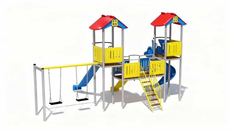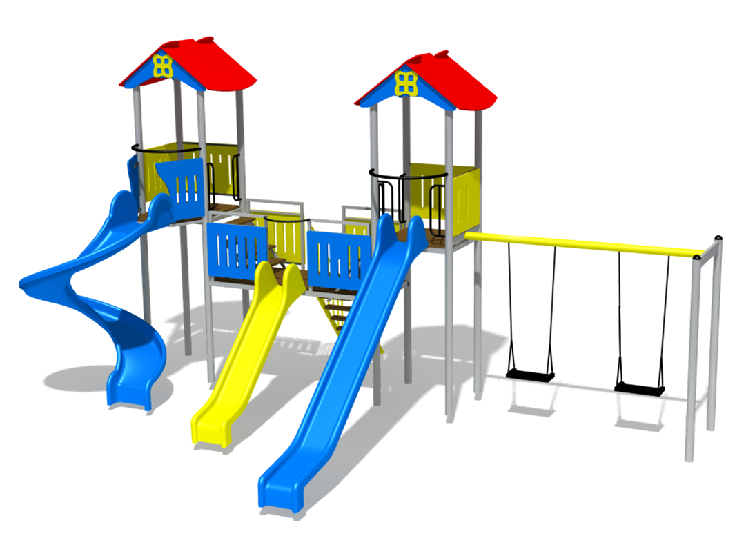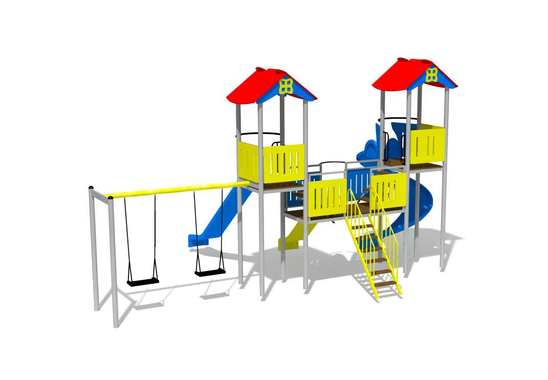 Produsul Complex de Joaca CJ.02.01 este confectionat din structura metalica tratata anticoroziv vopsita in camp electrostatic.