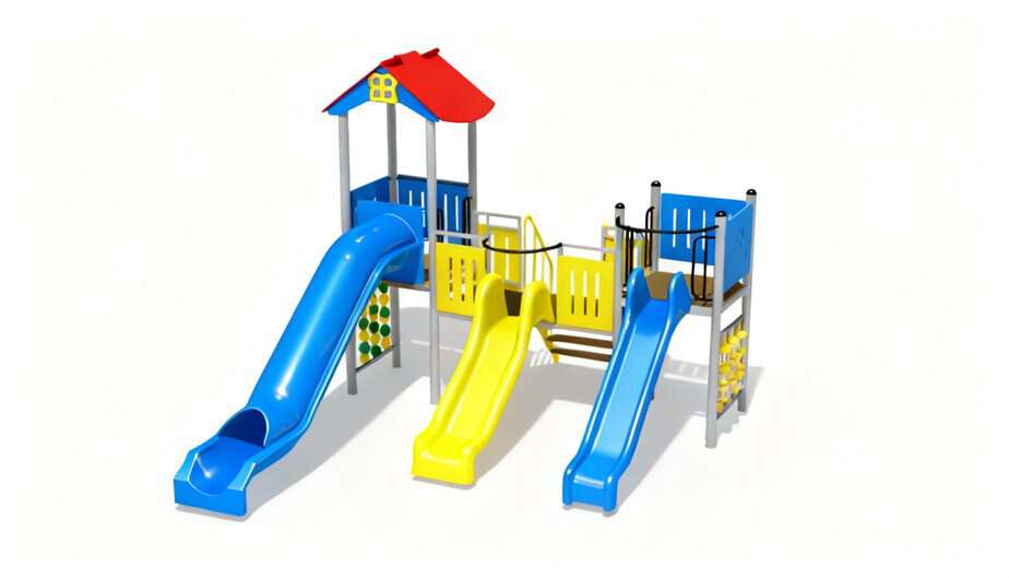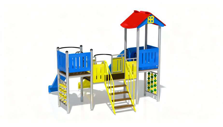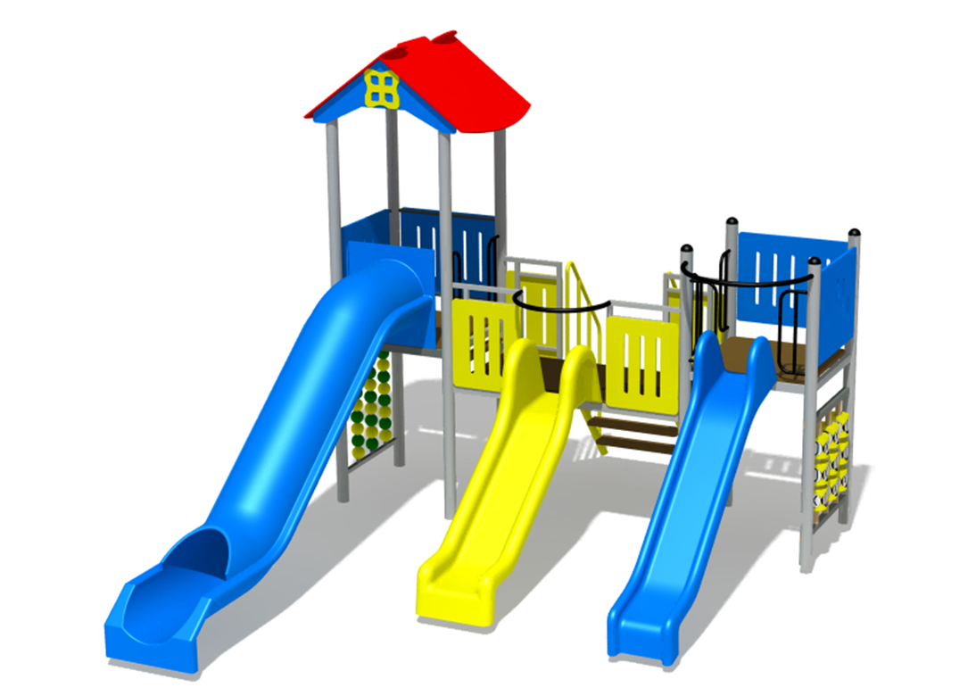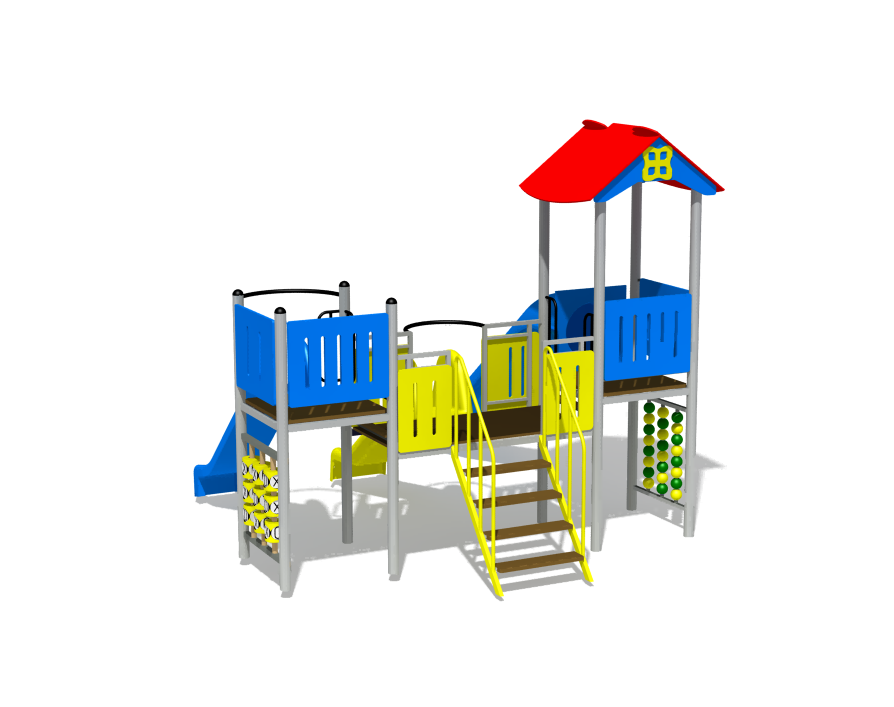Produsul Complex de Joaca CJ.03 este confectionat din structura metalica tratata anticoroziv vopsita in camp electrostatic.