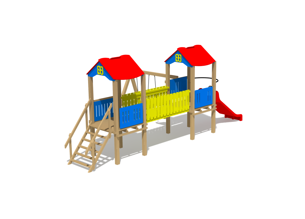 Produsul Complex de Joaca CJ.15 este confectionat din structura de lemn. Acoperit cu bait si lac pe baza de apa, este rezistent la intemperii.